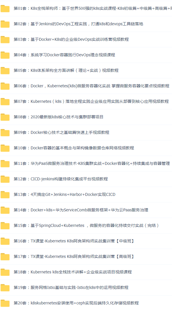 20套容器自动化套餐包含:微服务,容器,自动化,集群部署,持续集成,体系架构,实战训练营,Docker,K8s,DevOps,Jenkins,CICD,Git从部署到核心视频教程等。。。