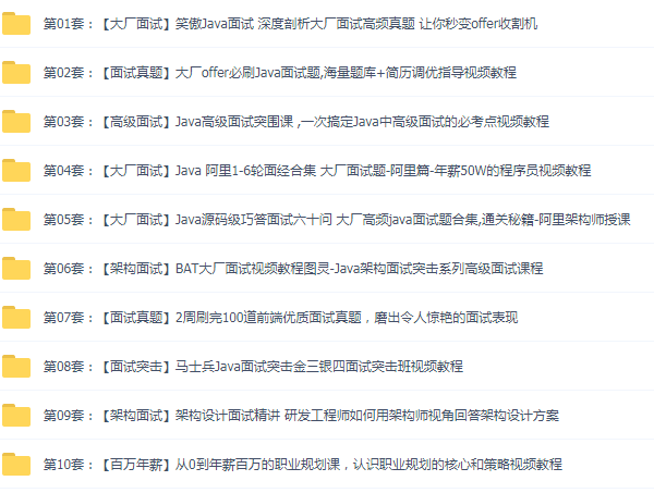 10套面试系列Java中高级和架构面试突围课 深度剖析大厂面试高频真题 海量题库 从0到年薪百万的职业规划视频教程