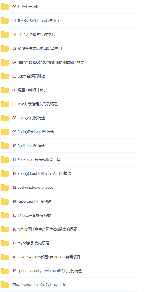 技术包含:SpringBoot,SpringCloudAlibaba,Spring5,Maven,Mybatis,Docker,K8S,Devops ,Jenkins,Elasticsearch,Nginx,Tomcat,RabbitMQ,RocketMQ,ActiveMQ,Kafka,Dubbo,Solr,SSO,CAS,OA,Ehcache,Memcached,Activiti,Java架构设计,系统设计,亿级流量并发,架构思维,设计模式,算法精讲,源码剖析,云原生,微服务,分布式,性能优化,稳定性,安全性,高并发,高可用,高可扩展,高性能,集群搭建,分布式事务,分库分表,团队协作,持续集成,自动化部署等。