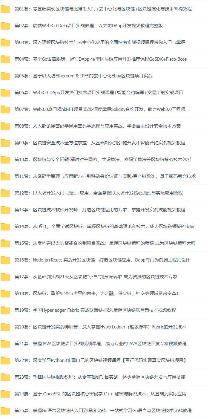 总目录:25套区块链从基础到高级课,比特币,以太坊,智能合约,超级账本,去中心化应用实战,Java区块链项目实Python3实现区块链视频教程