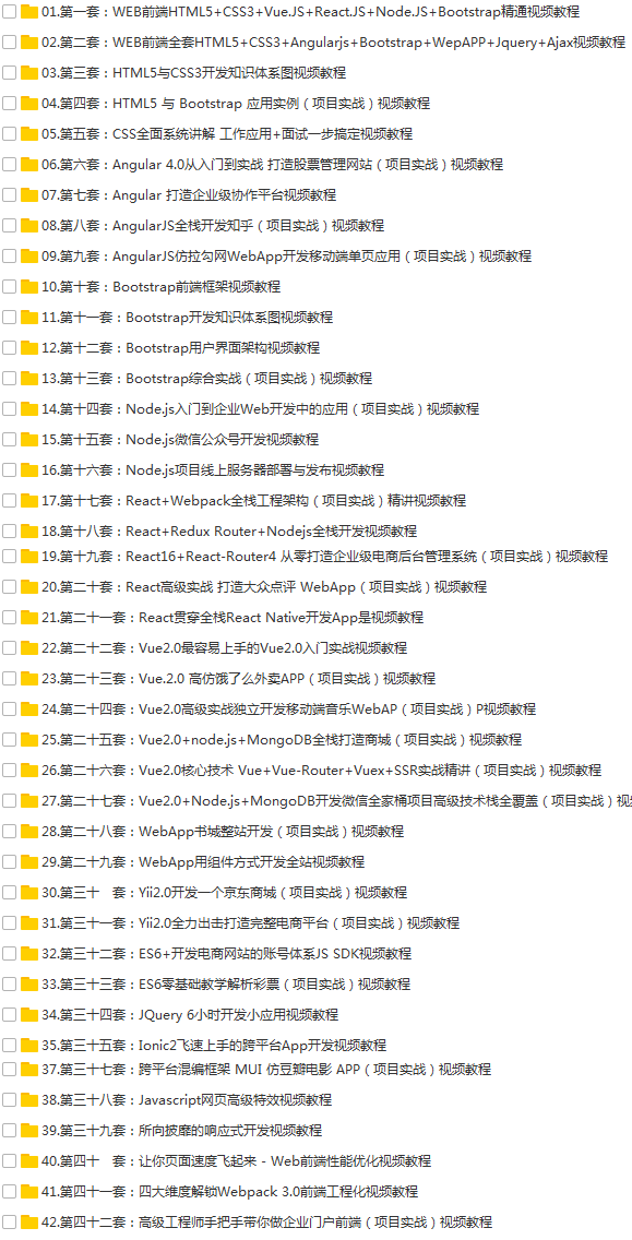 42套WEB前端包含:HTML5,CSS3,VueJS,AngularJS,NodeJS,ReactJS,Bootstrap,Webpack,Ajax,JQuery,WepApp,Yii2.0,ES6,Laravel5.4,响应式开发,组件式开发,全栈开发,知乎项目,拉勾网项目,企业级写作平台,用户界面架构,微信公众号开发,全栈工程架构,大众点评项目,饿了么项目,微信全家桶项目,京东商城,电商平台,仿豆瓣电影App,网页特效,高级项目实战等高端视频教程
